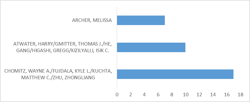A Figura 6 mostra a relação dos 10 principais inventores em energia solar fotovoltaica. O WAYNE CHOMITZ com 17 pedidos de patentes, é vice-presidente de finanças do grupo coronal, uma empresa de pesquisa focada no desenvolvimento de novos materiais com energia limpa. E também com a mesma quantidade de pedidos de patentes estão os inventores KYLE L. FUJDALA, MATTHEW C. KUCHITA E ZHONGLIANG ZHU.