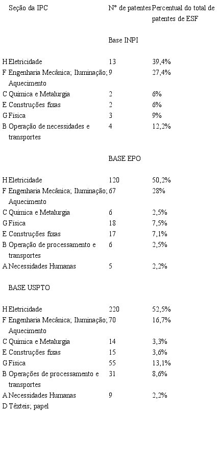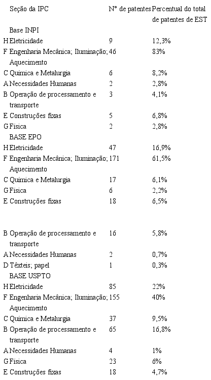 Ao avaliarmos as patentes em energia solar térmica observamos na base do INPI que aproximadamente 95,3% estão concentradas na seção F e H, que se refere à “Engenharia Mecânica, Iluminação e Aquecimento” e “Eletricidade”, e na base EPO que cerca de 78,4% estão relacionados também as seções F e H, que se refere à “Engenharia Mecânica, Iluminação e Aquecimento” e “Química e Eletricidade”, e na base americana o USPTO é de 62% as seções F e H, respectivamente, conforme demonstrado na Tabela 2.