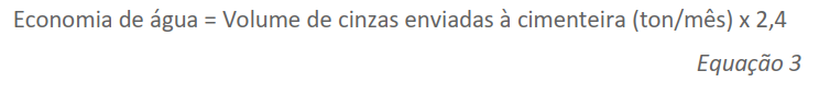 [Equação 2]A redução do consumo de água bruta da usina termoelétrica foi avaliada durante o descarregamento das cinzas, em razão de sua utilização para umectar as cinzas nos pátios internos da usina. Partiu-se da premissa de que para cada três caçambas (capacidade: 12 m3 cada) de cinzas leves descarregadas no pátio interno, um caminhão-pipa (capacidade: 15 m3) de água é necessário para umectar as cinzas leves e diminuir a emissão de materiais particulados. Sendo assim, para cada 36 m3 de cinzas descarregadas no pátio da usina gasta-se 15 m3 de água bruta. Baseado nessa estimativa, o volume total de cinzas (ton/mês) reaproveitadas foi calculado de acordo com o resultado da razão entre os valores 36 m3 e 15 m3. Tal cálculo resultou no fator 2,4 (Equação 3).
