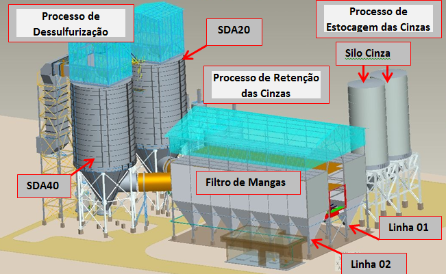 O sulfito de cálcio (CaSO3) em fase sólida, o qual é formado dentro das torres absorvedoras, assim como os incombustos e as cinzas formadas durante a combustão na caldeira, são capturados pelos filtros de manga. Tal processo explica o fato de esses dois primeiros parâmetros serem requisitos balizadores no estudo de caracterização e destinação das cinzas.