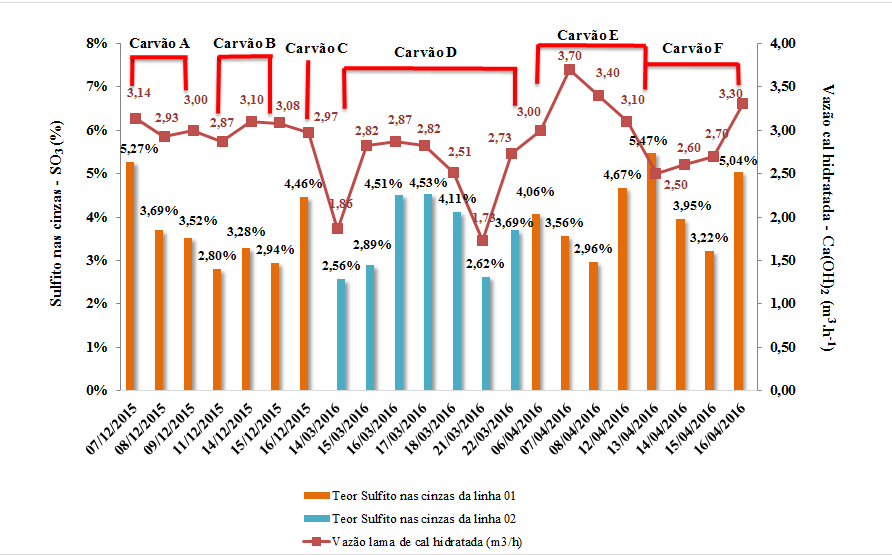 O Gráfico 1 mostra os resultados dos três períodos de testes da caracterização química do teor de sulfito nas cinzas leves e evidencia como a dosagem de CaO interferiu diretamente na qualidade das cinzas. Quanto maior o teor de enxofre no carvão a ser queimado na caldeira, maior a carga de cal virgem necessária durante o processo de dessulfurização, e maior o teor de sulfito nas cinzas. Os valores de sulfito ultrapassaram os limites estabelecidos como parâmetros para as cimenteiras quando houve a necessidade de um incremento adicional de CaO no processo, isto é, a carga de CaO foi superior a 0,3 ton/h. Esse é um aspecto importante a ser considerado, pois a presença de trióxidos de enxofre, SO3, pode afetar a qualidade das cinzas leves quanto ao desenvolvimento de características mecânicas e do tempo de pega do cimento, ou seja, tal processo pode alterar significativamente o tempo de secagem do cimento.
