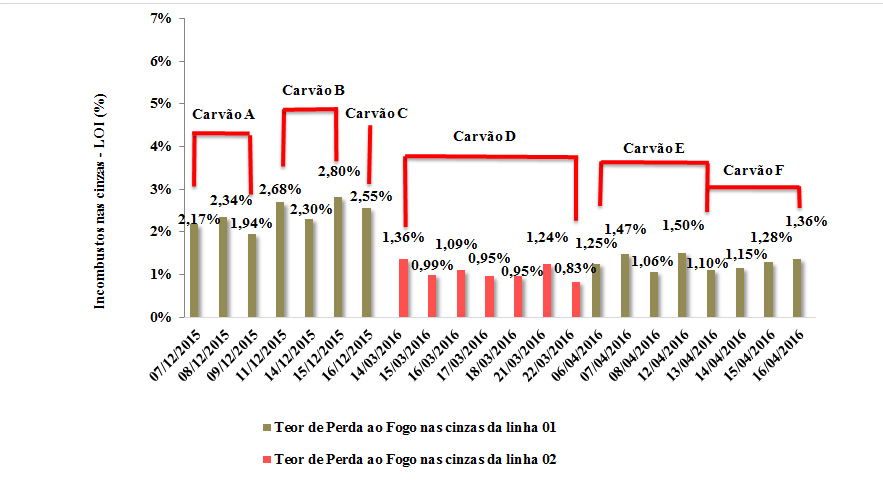 De fato, as elevadas concentrações de materiais incombustos nas cinzas pesadas são possivelmente causadas pela ineficiente cominuição de carvão nos moinhos e, por consequência, de uma granulometria do carvão mineral fora dos parâmetros de processo antes da injeção desse carvão na zona de queima.