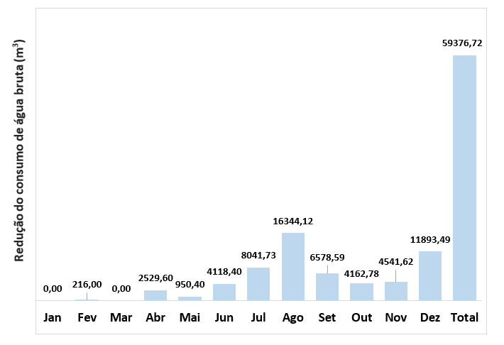 O Gráfico 4 mostra que o total na redução do consumo de água gerado pelo reaproveitamento das cinzas foi de 59.376,72 m3, somente em 2016. A destinação das cinzas para a fabricação de cimento contribuiu significativamente para reduzir a geração da água dessalinizada, bem como para diminuir e seu consumo na usina termoelétrica em questão. O Programa Nacional da Água (PNA) calculou um desperdício na ordem de 30% em 2000 e 22,5% em 2009 na Indústria cimenteira. A meta para 2020 é chegar a 15% de desperdício, o que representa uma redução significativa nos valores totais. De acordo com o presente estudo, houve um ganho ambiental significativo, uma vez que a usina termoelétrica estudada economizará muita água bruta. Esse resultado não só gerará ganhos econômicos e ambientais, mas também no atendimento às metas governamentais (WEBER et al., 2010).