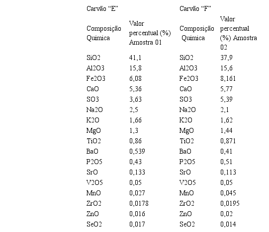A Tabela 1 mostra os resultados das análises das cinzas leves realizadas através de fluorescência de raio-x. Apenas duas amostras foram selecionadas para os testes, uma vez que não foram observadas variações significativas nas composições do tipos de carvão utilizados durante os testes e nos tipos de caldeira. Os dados na Tabela 1 evidenciam a caracterização dos óxidos presentes nas cinzas estudadas, ou seja, embora tenha havido certo grau de variação na petrologia dos componentes orgânicos, os tipos de carvão utilizados nos testes possuíam características semelhantes às da matéria mineral. Foi possível constatar também que aproximadamente 60% das cinzas leves eram compostas por óxidos de silício (sílica), alumínio (bauxita) e ferro (hematita). Tal composição corresponde às concentrações médias 39,5%, 15,7% e 7,1%, respectivamente. O restante dos constituintes químicos era formado por outros óxidos (oxido de cálcio, de enxofre, de sódio, de potássio e de magnésio) e por traços de outros metais na forma de dióxido de titânio, óxido de bário, pentóxido de fósforo, óxido de estrôncio entre outros.
