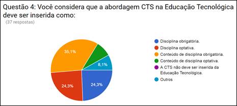Na questão 4 como mostra a figura 5, fica evidente que na opinião dos professores que responderam à pesquisa, a temática CTS deve ser aplicada de maneira obrigatória, sendo 35,1% dos entrevistados. Nenhum dos entrevistados consideraram a CTS desnecessária para a educação tecnológica, o que é positivo diante da expectativa de respostas deste trabalho.