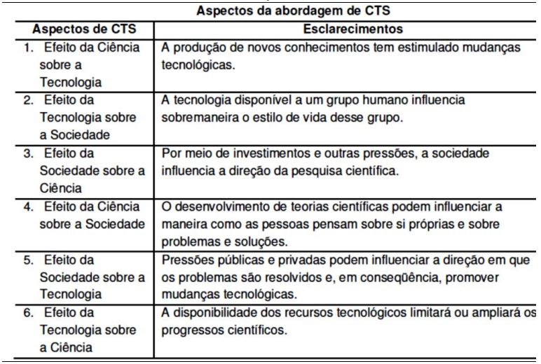 De modo geral, busca discutir a “[...] ciência e a tecnologia tendo em vista suas relações, consequências e respostas sociais. [...] Já são amplamente abordados em vários países da Europa e nos Estados Unidos, invadindo não só discussões acadêmicas ou comunidades específicas, assim como os diversos níveis escolares” (BAZZO, 2002, p. 93).