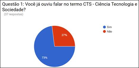 Nesta etapa a coleta dos dados foi efetuada por meio de questionário eletrônico enviado aos professores dos cursos de graduação categorizados em tecnologia, bacharéis e engenharias. Um total de 100 professores receberam a pesquisa e apenas 37 retornaram. As questões foram direcionadas a avaliar o conhecimento dos professores e coletar opiniões pessoais com relação à temática CTS. Segue abaixo os gráficos quantitativos das quatro primeiras questões: