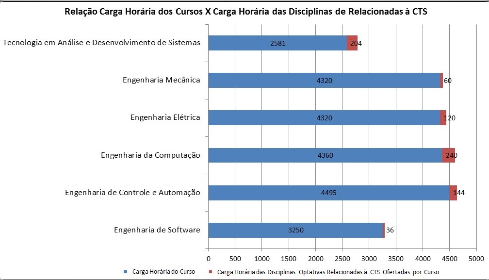 Apenas uma entre as cinco disciplinas ofertadas apresentou a temática completa da temática CTS em sua ementa. A carga horária das disciplinas é pequena em relação a carga horária dos cursos e é pequena comparada às disciplinas técnicas, tal informação é preocupante o que nos revela uma perspectiva ainda baixa sobre a temática apesar de sua importância para a sociedade.