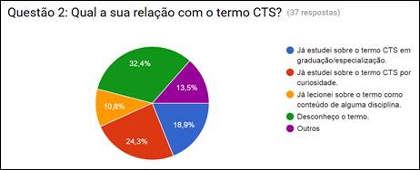 Já na segunda questão, a maioria dos professores 31,4% (11 entrevistados) dizem desconhecer o tema. Analisando que a opção “Outros” da pergunta não teve nenhuma justificativa pela escolha, considera-se que “Outros” também desconhecem o termo, o que totaliza 45,5%, 17 entrevistados, quase 50% não deixaram explícito seu conhecimento sobre CTS.