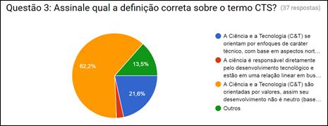 As questões foram elaboradas pelos autores com base em Dagnino (2002; 2007). A resposta ‘a’ corresponde a visão determinista da C&T, a resposta ‘b’ corresponde a visão de neutralidade da C&T, e resposta ‘c’ corresponde a visão da CTS. A maioria dos respondentes (62,2%) responderam corretamente, contudo aproximadamente 1/3 desconhecem ou não tem a compreensão correta da CTS.