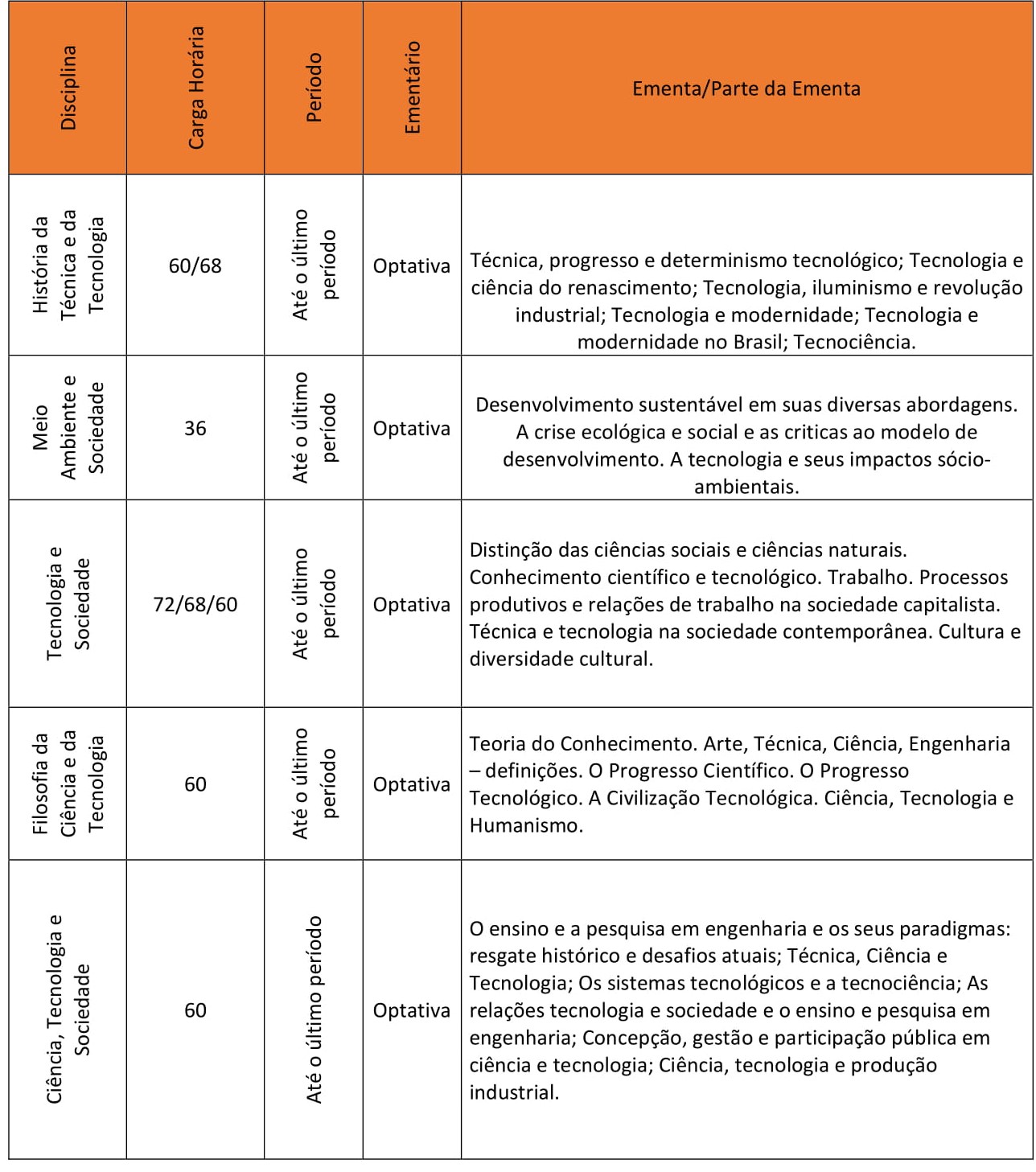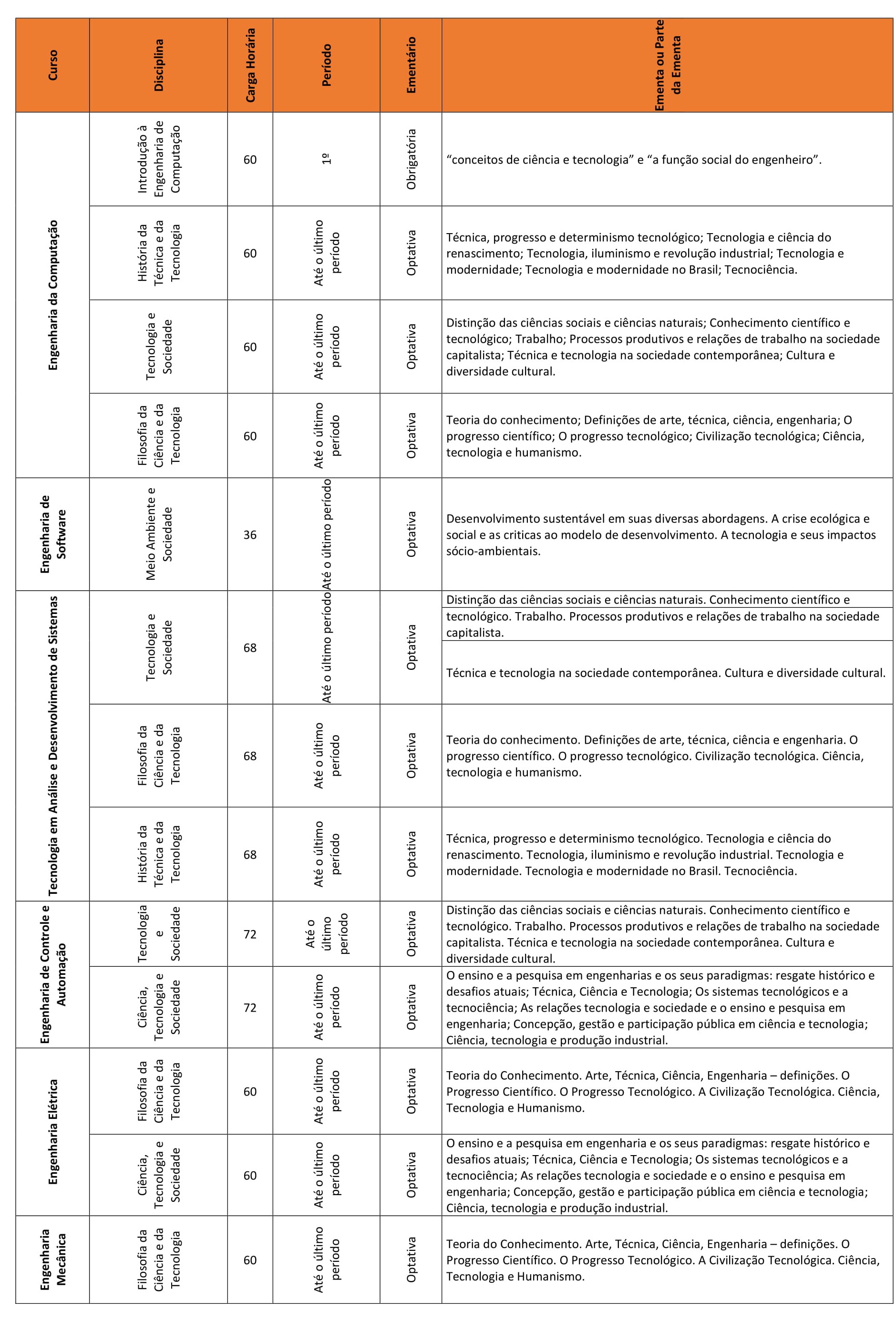 As disciplinas mais comuns apresentadas nos cursos são: Tecnologia e Sociedade e Filosofia da Ciência e da Tecnologia. Contudo, são disciplinas optativas que por sua vez, apesar da oferta ser semestral, aferimos em contato informal com a secretaria acadêmica da Instituição, que a abertura das turmas ocorre apenas mediante quantidade mínima de alunos matriculados na disciplina.