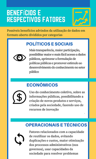 Autores como Janssen et al. (2012) e Espinoza et al. (2013) compartilham da crença de que existem potenciais benefícios advindos da utilização de dados abertos. Em particular, Janssen et. al. (2012) propuseram um framework, adotado neste trabalho, o qual classifica os possíveis benefícios em três grandes grupos, conforme figura 1.