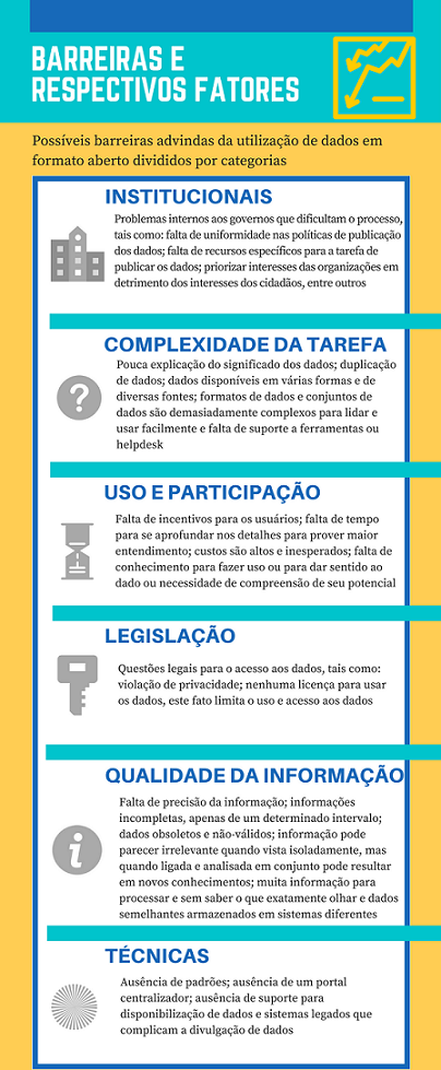 Estes mesmos autores também reconhecem barreiras significativas a estas iniciativas. Em particular, Janssen et. al. (2012) propuseram um framework, adotado neste trabalho, o qual classifica estas em: Institucionais; Complexidade da tarefa; Uso e participação; Legislação; Qualidade da informação e Técnicas, conforme figura 2.