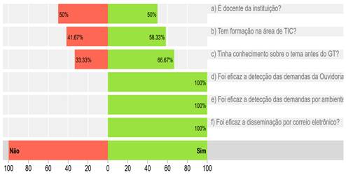 Conforme a figura 3 é possível perceber que quatro respondentes afirmaram não conhecer o tema antes de participarem do trabalho no GT, sendo um docente e três TAE, o que evidencia certo desconhecimento do tema. Em relação à metodologia utilizada no trabalho, os respondentes foram unânimes em considerar: (i) a relevância ou eficácia da detecção das informações a serem publicadas através da análise dos assuntos mais solicitados na ouvidoria da instituição; (ii) a relevância ou eficácia da detecção das informações a serem publicadas através de ambientes virtuais de discussão e de gestão participativa; e (iii) a relevância ou eficácia da disseminação, por meio de correio eletrônico, das atividades realizadas pelo GT.