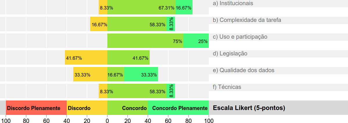 Com relação às possíveis barreiras (figura 4), questões relacionadas ao uso e participação (falta de incentivo para os usuários, falta de conhecimento para fazer uso ou para dar sentido a dado, entre outros) receberam a maior concordância dos membros do GT, de forma que possuem potencial para representar a maior barreira para a utilização dos dados publicados em formato aberto. Outro fator considerado por vários como sendo uma possível barreira está relacionado às questões institucionais, tais como: cultura de aversão ao risco, falta de recursos para publicizar os dados e confusão entre os valores públicos e privados.