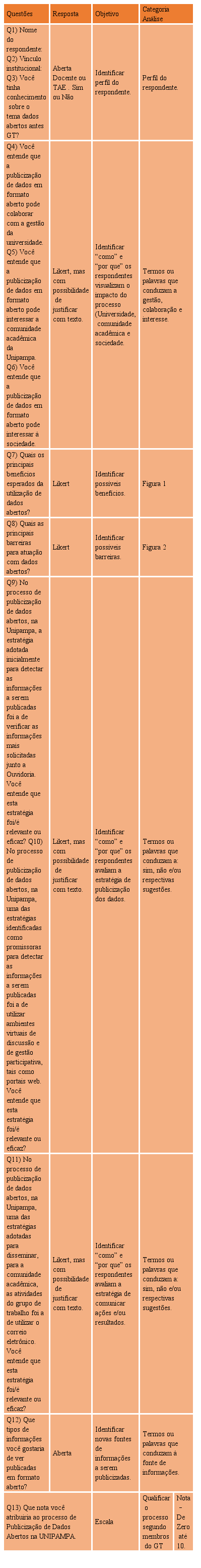 A coleta de dados foi realizada através de um questionário estruturado com questões abertas e fechadas (quadro 1), utilizando-se de recursos da ferramenta Google Docs. O Google Docs um pacote de aplicativos do Google, que funciona on-line. Alguns recursos são a portabilidade de documentos, que permite a edição do mesmo documento por mais de um usuário, combina características de um editor de textos e planilha. Este fato facilita a coleta e análise de dados na Internet (Wikipédia, 2017). Silverman (2009) afirma que as entrevistas ou questionários não precisam ser numerosos, mas devem ser representativos, devem ser capazes de fornecer as informações que o pesquisador busca – neste estudo, todos os doze membros do GT (ou 100%) responderam o questionário. O quadro 1 apresenta as treze questões do formulário (Q1 – Q13), com as respectivas possibilidades de respostas, objetivos e categorias de análise.