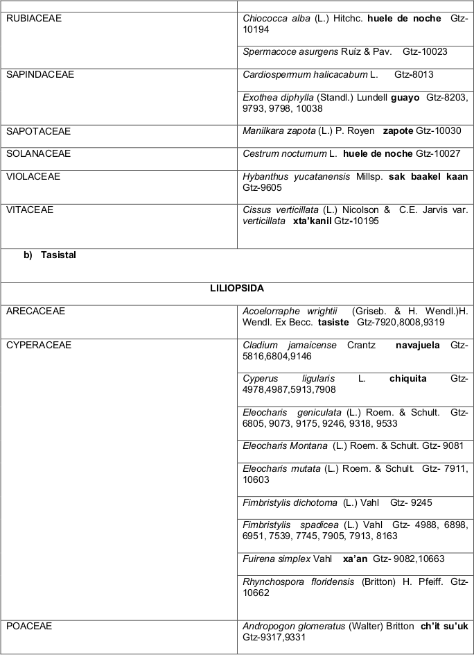 Valores de importancia de las especies.Las especies leñosas con mayor Valor de Importancia Relativa (VIR), las cuales representan un 99.49%, fueron 20: Terminalia buceras (25.76%), Ouratea lucens (11.94%), Metopium brownei (11.62%), Coccoloba barbadensis (10.38%), Pachira aquatica (8.35%), Piscidia piscipula (7.44%), Brabaisia berlanderiana (5.13%), Manilkara zapota (4.75%), Zygia recordii (3.12%), Sabal yapa (1.95%), Lonchocarpus rugosus (1.53%), Guettarda combsii (0.56%), Mariosousa dolichostachya (0.51%), Bonellia macrocarpa ssp. macrocarpa (0.48%), Sideroxylon celastrinum (0.48%), Acacia cornigera (0.48%), Xilosma flexuosa (0.47%), Tabernaemontana donnell-smithii (0.47%), Vitex gaumeri (0.47%) y Acacia sp (0.48%).