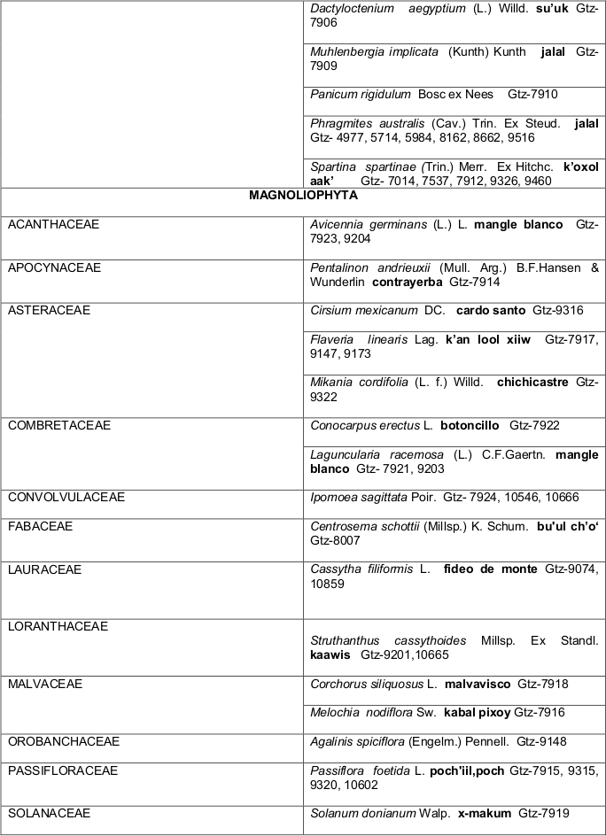 La composición florística de la comunidad estudiada estuvo representada por 22 especies para 0.1 ha; las familias mejor representadas fueron las Fabaceae y Sapotaceae, con 8 y 2 especies respectivamente. Las especies con mayor valor de importancia fueron: Terminalia buceras, Ouratea lucens, Metopium brownei, Coccoloba barbadensis, Pachira aquatica, Piscidia piscipula, Brabaisia berlanderiana, Manilkara zapota, Zygia recordii, Sabal yapa, Lonchocarpus rugosus, etc.