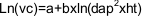 Para calcular la biomasa (materia seca) arbórea es necesario conocer el volúmen de cada uno de los individuos inventariados. Los volúmenes comerciales, es decir considerando ramas hasta 7 cm de diámetro, incluída la corteza se calcularon por medio del modelo logarítmico de variable combinada propuesto por Benitez et al. (2002), que incluye la altura total (HT) y el diámetro a la altura del pecho (DAP). El mismo fue ajustado por el método de los mínimos cuadrados ordinarios (Benitez et al., op. cit.).