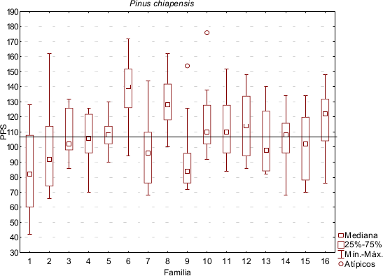 Potencial de Producción de Semillas. Se obtuvo un promedio general de 107.98 semillas potenciales por cono para el sitio evaluado con una variación de 42 a 178 semillas potenciales. Más del 75% de los valores potenciales de las familias 6 y 8 estuvieron por arriba del promedio general mientras que la familia uno, dos, tres, siete, nueve 13 y 15 tuvieron más del la mitad de sus conos con un potencial de producción de semillas por debajo del promedio general (figura 1).
