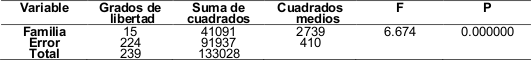 El análisis de varianza mostró diferencias estadísticas altamente significativas (p<0.05) entre familias (tabla 1).