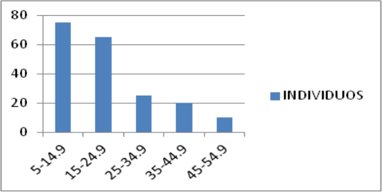 Estructura horizontal. Los diámetros de los individuos oscilaron entre 5-55 cm. El patrón de distribución de los diámetros mostró una disminución del número de individuos con el aumento de los diámetros, la mayor densidad de individuos se concentró en el intervalo de diámetro de 5-14.9 cm, mientras que el menor número de individuos correspondió a la categoría de 45-54.9 cm (figura 2).