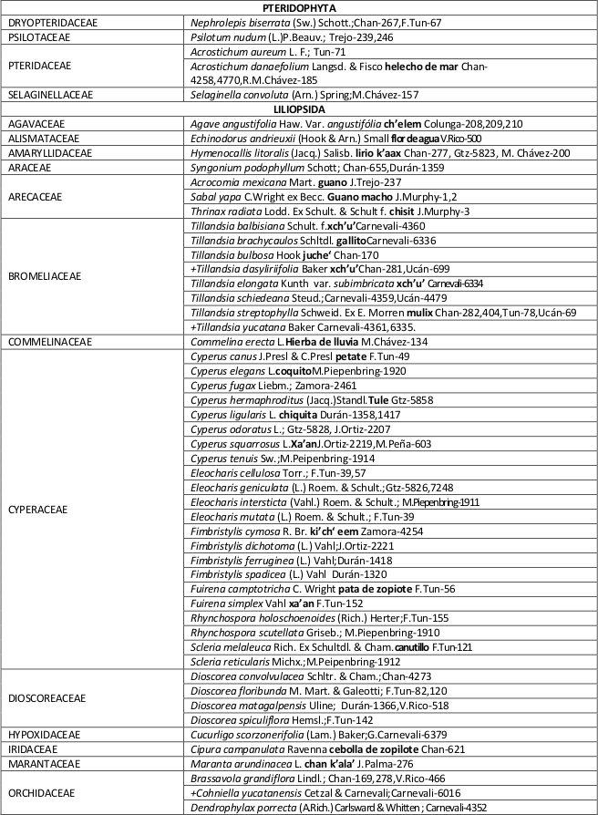 La composición florística de la comunidad estudiada estuvo representada por 13 especies para 0.2 ha; la familia mejor representada fue Moraceae con 2 especies. Las especies con mayor valor de importancia fueron: Laguncularia racemosa, Rhizophora mangle, Manilkara zapota, Sabal yapa, Metopium brownei, Melicoccus oliviformis spp. oliviformis, Ficus sp., Swietenia macrophylla, Ficus obtusifolia, Bursera simaruba, Gymnanthes lucida, Tabernaemontana alba y Brabaisia berlanderiana.