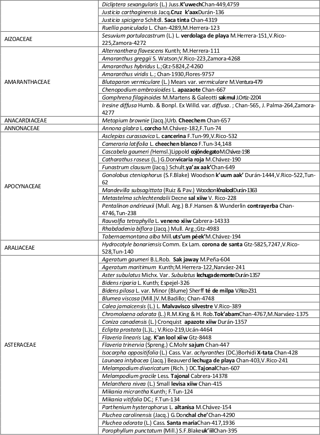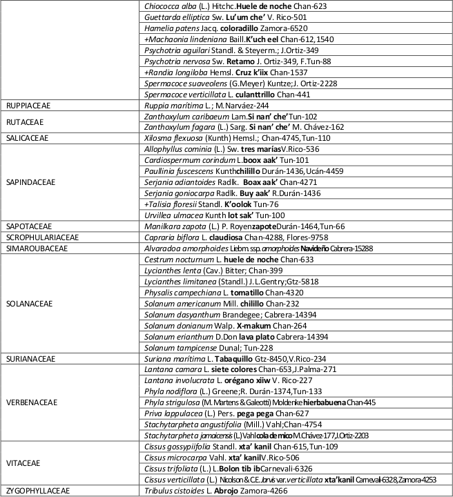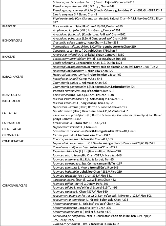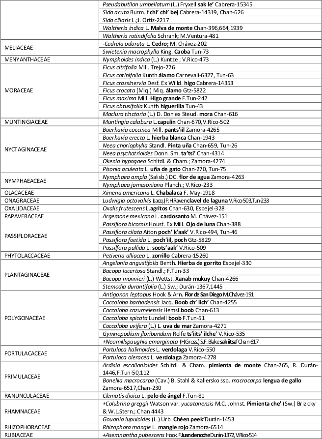 La Composición florística del área de estudio fue similar al reportado en otros trabajos realizados en la selva mediana subperennifolia en el área de Los Petenes (Durán, 1995; Gutiérrez-Báez et al., 2013, 2015; Koyoc-Ramírez et al., 2015;Zamora-Crescencio et al., 2015) con una composición florística claramente marcada por la dominancia de las especies: Laguncularia racemosa, Rhizophora mangle, Manilkara zapota, Sabal yapa, Metopium brownei, Melicoccus oliviformis spp. oliviformis, Ficus sp., Swietenia macrophylla, Ficus obtusifolia, Bursera simaruba y Brabaisia berlanderiana. De las familias mencionadas, Moraceae fue la que presentó mayor número de especies (dos).