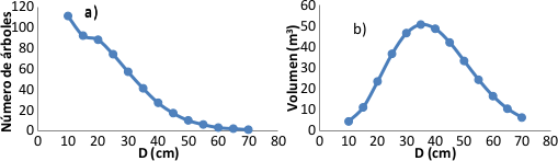 La figura 2 muestra el número de árboles y el volumen en función del diámetro de la parcela 5. Esto se logró una vez estimado el número de árboles utilizando la distribución Weibull. Se puede apreciar una distribució inversamente proporcional, a medida que aumenta el diámetro, disminuye el número de árboles (2a). En el caso del volumen (2b) se observa una distribución normal, en la que los árboles de las categorías diamétricas medianas son las que aportan el mayor volumen, mientras que las categorías menores y mayores el volumen es menor, lo anterior se debe principalmente al número de árboles y a sus dimensiones.