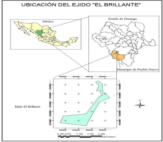 El Ejido Forestal El Brillante, se localiza en el macizo montañoso Sierra Madre Occidental dentro del municipio de Pueblo Nuevo, al suroeste del Estado de Durango (figura 1); está enmarcado geográficamente entre los paralelos 230 40’ 04” y 230 47’ 54” de latitud Norte y los meridianos 1050 21’ 31” y 1050 29’ 52” (González et al., 2013).