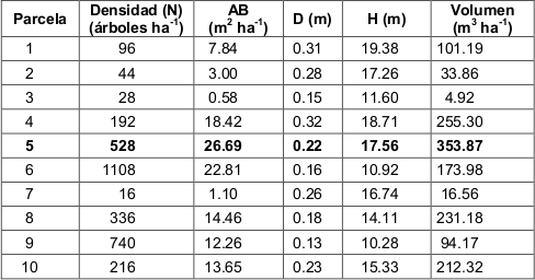 Los valores de los datos dasométricos obtenidos para cada una de las parcelas se presentan en el cuadro 1. Como puede observarse los valores de densidad (N), tienen un amplio rango de variación. Puede apreciarse que las parcelas 5, 6 y 9 tienen el mayor número de árboles por ha-1, mientras que en las parcelas 2, 3 y 7 se presentan los valores más bajos. Esto, se debió, seguramente a la ubicación de las parcelas y a las diferentes calidades de estación que influyen directamente en el número de individuos presentes en el sitio (Daniel et al., 1982).