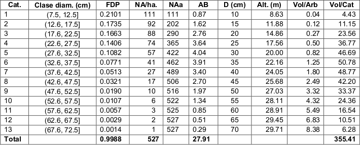 Dónde: Cat =Número de la clase diamétrica, FDP=Probabilidad por categoría diamétrica (aplicación de la FDP), NA=Número de árboles por hectárea por clase, NAa=Frecuencia acumulada del número de árboles por hectárea por clase. AB=Área basal (m2 ha-1) por clase, D=Valor del punto medio de la categoría diamétrica, Alt=Altura media de los árboles dominantes y codominantes, Vol/Arb=Volumen por árbol (m3), Vol/Cat=Volumen por categoría diamétrica (m3 ha-1).