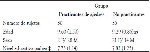 La muestra, obtenida a través de un muestreo no probabilístico intencional, estuvo conformada por 65 ni ños, de los cuales 42 (64,6 %) eran varones y 23 (35,4 %) eran mujeres. El 29,2 % (n = 19) de los niños tenía 8 años, el 20 % (n = 13) tenía 9 años, el 36,9 % (n =24) tenía 10 años, el 6,2 % (n = 4) tenía 11 años y el 7,7 % (n = 5) tenía 12 años. Del total de participantes, 35 no tenían ninguna experiencia con el ajedrez y asistían a dos instituciones educativas y los otros 30 eran practi cantes activos de ajedrez. Los criterios de inclusión para los practicantes de ajedrez fueron: 1) que asistieran a un taller organizado específicamente para niños de su edad, ya sea municipal o privado y 2) que llevaran un mínimo de dos años practicando sistemáticamente el deporte. Para la muestra total se consideró, además, que los niños no presentaran antecedentes clínicos, neurológicos ni psiquiátricos, y que cursasen sus estudios escolares con regularidad, sin repitencia escolar. En cuanto a los ni ños que eran practicantes activos de ajedrez, la media de edad fue de 9,40 (DE = 1,50), siendo 2 niñas y 28 niños, siendo la media del nivel educativo de los padres 7,73 (DE = 1,14), correspondiendo a un nivel universitario in completo. En relación al grupo de niños que no tenían experiencia, la media de edad fue de 9,29 (DE = 0,86). El grupo quedó conformado por 21 niñas y 14 niños. En este caso, la media del nivel educativo de los padres fue de 7,83 (DE = 1,25), correspondiéndose también a un nivel universitario incompleto. En la Tabla 1 se presen tan las características sociodemográficas para cada grupo (practicantes de ajedrez vs. no practicantes). Dado que la edad es un factor asociado al desempeño en tareas que valoran las FE (Arán-Filippetti, 2011), para controlar esta variable, se realizó una prueba t para muestras inde pendientes para estudiar si existían diferencias significa tivas en cuanto a la edad según la práctica de ajedrez. Los resultados indicaron que no existen diferencias entre los grupos Practicantes ajedrez vs. No practicantes (t (63) = 1.014, p = .316) (ver Tabla 1).