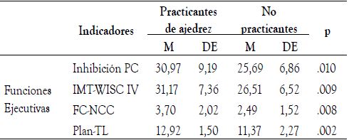 El objetivo del presente estudio fue examinar las diferencias de rendimiento cognitivo en tareas que valoran las FE entre niños practicantes de ajedrez y no practicantes. Nuestros resultados indican que los niños que practican ajedrez presentan puntuaciones superio res en tareas que valoran la planificación, la inhibición, la memoria de trabajo y la flexibilidad cognitiva respecto de aquellos que no lo practican. Estudios previos tam bién hallaron efectos del ajedrez, no solo en diferentes tareas que valoran las FE (Unterrainer et al., 2006; Rojas-Vidaurreta, 2001), sino también en dominios cognitivos como la habilidad meta-cognitiva y la resolución de problemas matemáticos (Kazemi et al., 2012), en el rendimiento académico en matemáticas y lengua (Gliga & Flesner, 2014) y en el desarrollo socio-emocional de niños y adolescentes (Aciego et al., 2012).