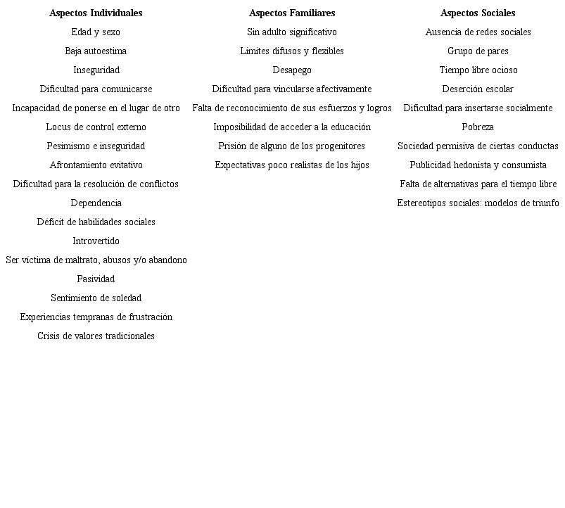 En las Tablas 1 y 2 se muestran los factores protectores y los factores de riesgo en sus dimensiones individuales, familiares y sociales.