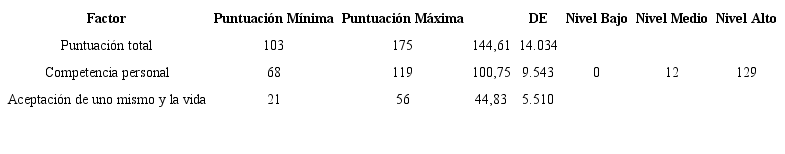 De manera general, los resultados revelan que la muestra de universitarios presenta un puntaje medio de 144,61, el cual expresa un nivel alto de resiliencia de acuerdo con los parámetros expresados anteriormente (Tabla 3).