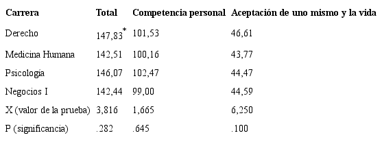 Para comenzar con los análisis bivariados, se abordó en primer lugar la comparación de los niveles de resiliencia de acuerdo con la carrera de los estudiantes; y, como ya se advirtió, esta se realizó a través de la versión no paramétrica del análisis de varianza, es decir, la prueba H de Kruskal Wallis (Tabla 4).
