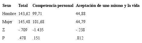 Bajo las mismas consideraciones, se abordó la comparación de los niveles de resiliencia por sexo de los estudiantes. En tal sentido, se evidenció la ausencia de resultados significativos, tanto para el puntaje total como para todos los factores de la escala (p=.478; .151 y .812); sin embargo, es posible detectar una tendencia de la mujeres a obtener valores más altos (Tabla 5).