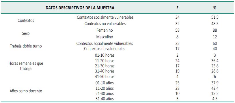 Se trabajó con 66 docentes, de los cuales 34 trabajan en dos establecimientos educativos de la provincia, pertenecientes a contextos socialmente vulnerables, según el criterio de la Dirección General de Escuelas (DGE, 2017), y con los que se integró un primer grupo. Las mismas reciben población de barrios periféricos caracterizados por factores como precariedad laboral y dificultades en al acceso a recursos económicos, sociales, de salud y educación. El otro grupo, constituido por 32 docentes, desempeña su labor en contextos sin esta característica y recibe población de un nivel socioeconómico medio y medio-bajo, pero con ninguna o menores dificultades en el acceso al trabajo, la salud, educación, redes sociales y oportunidades de desarrollo. La muestra contó con 8 participantes de sexo masculino (12 %) y 58 (88 %) de sexo femenino, con edades que oscilaban entre los 28 y 58 años (M=41.79 D=7.282) y un predominio del rango de edad entre los 40 y 49 años (47 %). De la totalidad de los participantes (N=66) el 51.5 % trabajan en contextos socialmente vulnerables y 48.5 % en contextos sin vulnerabilidad. A su vez, trabajan entre 11 y 20 horas semanales (36.4 %) y presentan una antigüedad laboral de entre 11 y 20 años (Tabla 1). La distribución según sexo y contexto puede observarse en la Tabla 2.