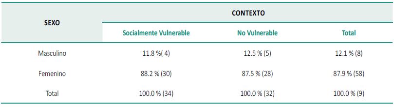 La Tabla 2 registra la distribución en términos de frecuencia y porcentaje de los docentes evaluados según sexo y tipo de contexto. Se puede observar que el mayor porcentaje en ambos contextos se concentra en el sexo femenino.