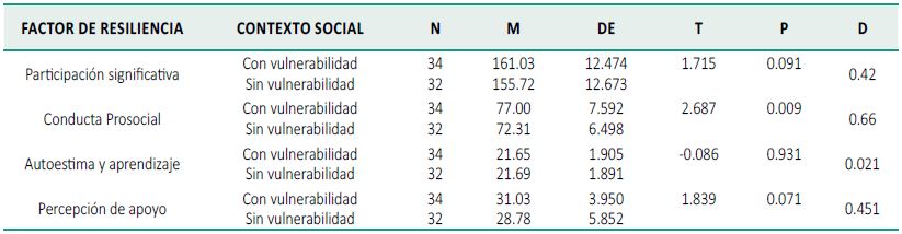 Resultados: Indicaron diferencias significativas en el factor conducta prosocial, presentando puntajes más altos los docentes de contextos vulnerables, y una tendencia a la significación en los factores percepción de apoyo y participación significativa, a favor del mismo grupo. Esto señala la importancia del apoyo mutuo, el trabajo en equipo y el respaldo institucional como factores protectores.