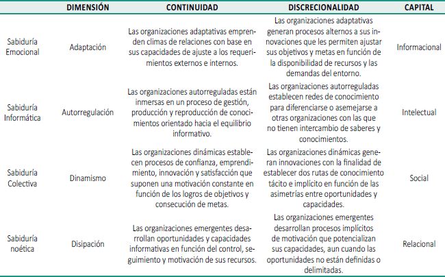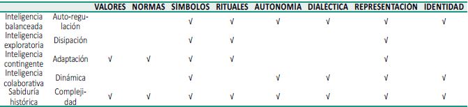 Se trata de una serie de características y atributos organizacionales que distingue a las inteligencias de las sabidurías en su proceso de creación del conocimiento. Valores, normas, símbolos, rituales, autonomía, dialéctica, representación e identidad son ahora subprocesos que distinguen a las dimensiones organizacionales complejas de auto-regulación, disipación, adaptabilidad y dinamismo. A su vez estás distinciones explican las diferencias entre las organizaciones inteligentes respecto a las sabidurías organizacionales (véase Tabla 4).