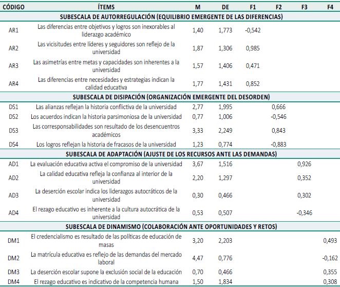 La Tabla 6 muestra las propiedades estadísticas de las respuestas a los estímulos o ítems aplicados a los 300 administrativos, docentes y estudiantes en relación a cuatro dimensiones complejas: autorregulación, disipación, adaptabilidad y dinamismo.