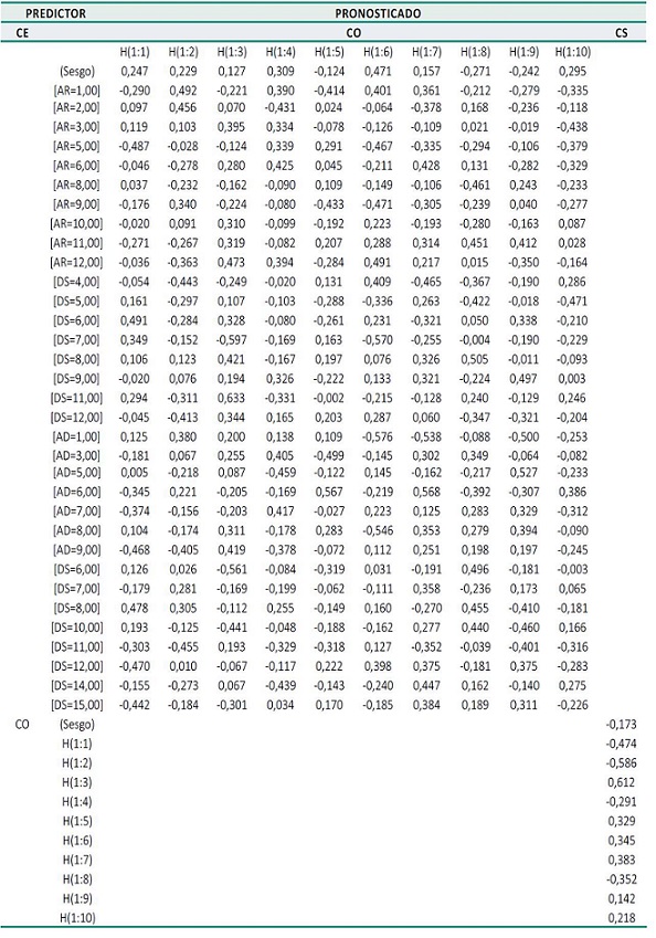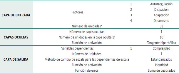 Una vez establecidas las cuatro dimensiones complejas: autorregulación, disipación, adaptabilidad y dinamismo se procedió a estimar la red neuronal, sus capas de entrada, ocultas y de salida para evidenciar el grado de aprendizaje al observar sus diferencias en los algoritmos (véase Tabla 7).