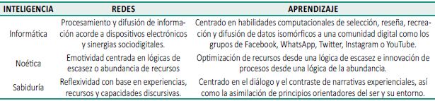 La inteligencia noética o afectiva supone relaciones discretas o estructuras provisionales, relaciones esporádicas y acciones emergentes que se complementan con la sabiduría informática que consiste en el establecimiento de relaciones continuas de control, obediencia y conformidad desde liderazgos tradicionales o autocráticos, estructura vertical, comunicación unidireccional y motivación unilateral (véase Tabla 2).