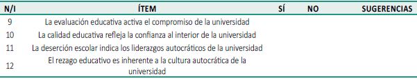 Instrucción para el juez experto: por favor lea cuidadosamente cada uno de los reactivos y conteste la pregunta ¿Corresponde el ítem a la dimensión que se está planteando?, marque su respuesta con una (X) en la columna correspondiente. Realice sugerencias a los ítems si lo considera pertinente para “salvar” o mejorar el ítem. De antemano, muchas gracias.