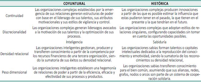 Es así como las organizaciones complejas se distinguen de las demás por su densidad y peso relacional observable en sus convenios o acuerdos de cooperación, producción y competitividad, así como por la edificación de una inteligencia provisoria de una sabiduría histórica y por ende significativa al ser transferida en sus arcos de comunicación y motivación (García, Mejía, Hernández, López & Salinas, 2015).