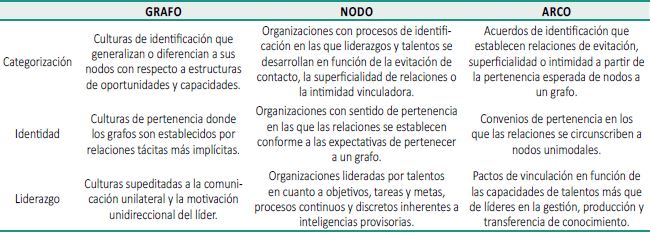Las organizaciones complejas edifican una identidad que consiste en las posibilidades de elección de un nodo respecto a otros (García, 2005). Es el caso de las redes sociales que promueven la interrelación entre sus usuarios, pero sobre todo, difunden la posibilidad de entablar contacto con otros usuarios desconocidos (García, Carreón, Sandoval, Bustos & Aguilar, 2016b). Empero, el usuario debe establecer criterios de selección y categorización de información con la finalidad de conservar o transformar el grafo al que pertenecen, o bien, reconstruir el nodo y los arcos que le permitieron formarse como un intangible o capital intelectual de la organización (véase Tabla 5).