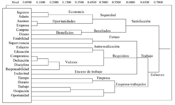 El análisis de conglomerados jerárquicos permitió conformar el dendograma con la agrupación de las palabras realizadas por los participantes para empleo, se muestra en la Figura 1. Con lo cual se tiene la organización de las dimensiones culturales, de tal forma que los temas ubicados a la derecha representan al conjunto de términos del listado de la izquierda de la figura. Así para los participantes el concepto de empleo se conforma de dos dimensiones: satisfacción y esfuerzo. La primera se subdivide en seguridad (incluye economía y oportunidades) y resultados (beneficios). La dimensión esfuerzo se conforma de trabajo (subdimensiones: futuro, requisitos y exceso de trabajo) y de la relación empresa-trabajador.