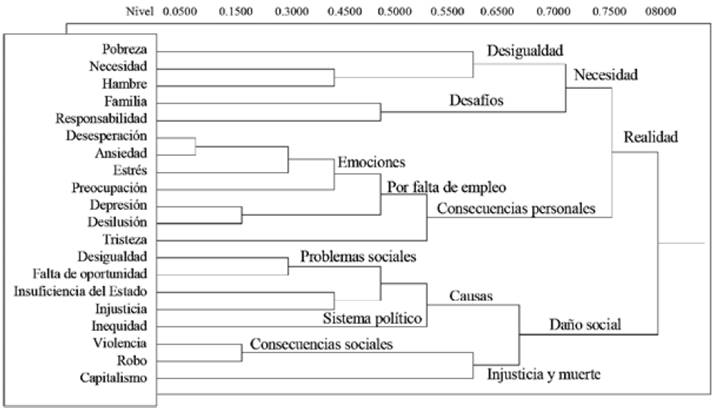 El análisis de conglomerados jerárquicos permitió conformar el dendograma con la agrupación de las palabras realizadas por los participantes para desempleo, se muestra en la Figura 2. Con lo cual se tiene la organización de las dimensiones culturales, de tal forma que los temas ubicados a la derecha son los temas que representan al conjunto de términos del listado ubicado a la izquierda de la figura. Así para los participantes el concepto de desempleo se conforma de dos dimensiones: realidad y daño social. La primera se subdivide en necesidad (incluye desigualdad y desafíos) y consecuencias personales (emociones negativas generadas por la falta de empleo). La dimensión daño social se conforma de causas (subdimensiones problemas sociales y sistema político) y de injusticia y muerte (consecuencias sociales como robo y violencia).